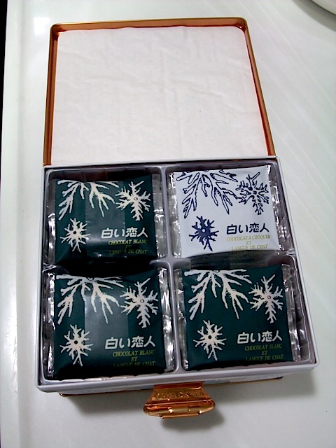 Chocolate Croquer Et Langue De Chat (白之戀人) is a souvenir from Japan that could only be bought no where in center tokyo but the tax free shop in the airport. There were lots of wrapping with this box. First the outer paper wrapping, then the hard paper box and finally a exquisite tin box. The tin box is so pretty I am definitely gonna keep it after I have finished the whole thing. The box came with 2 flavours, milk chocolate and white chocolate.